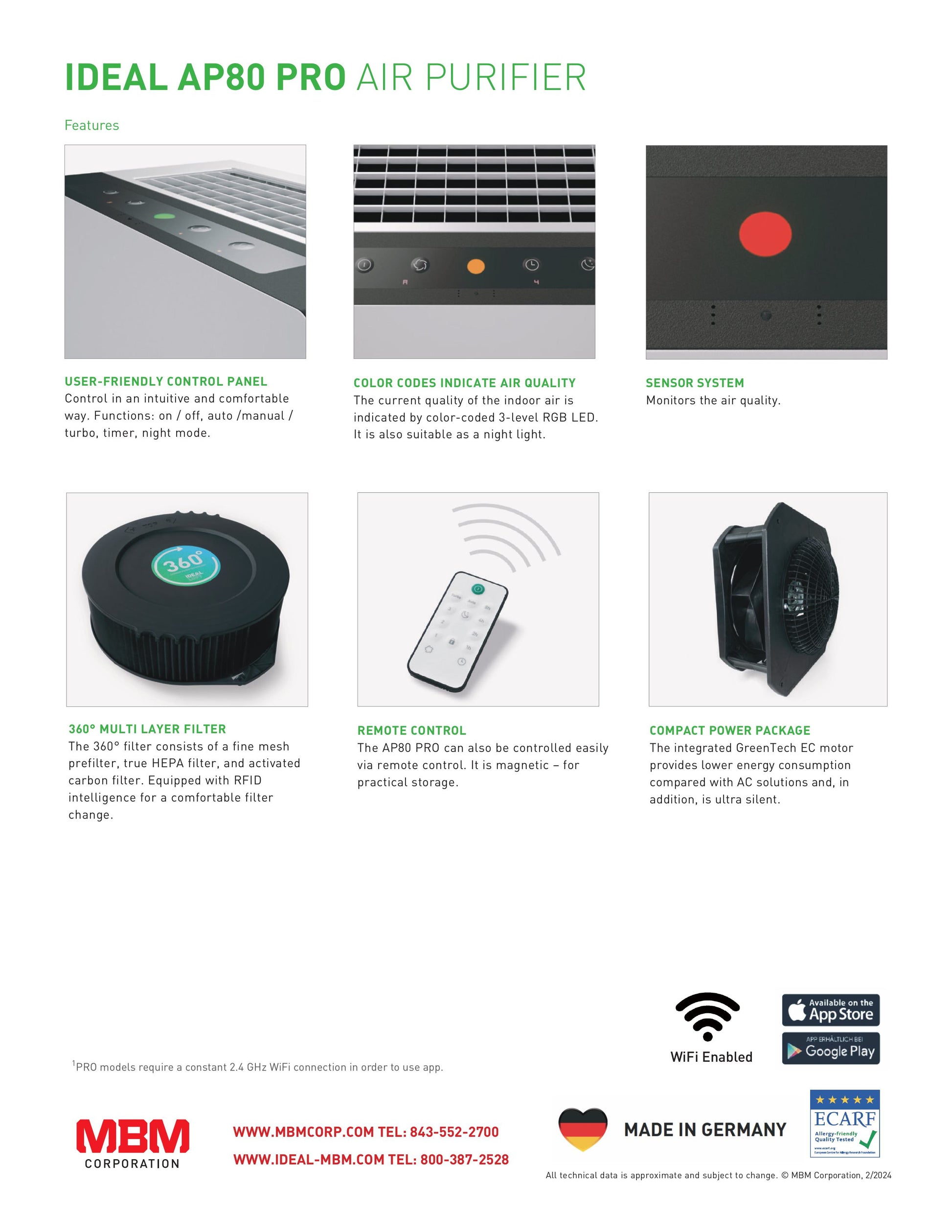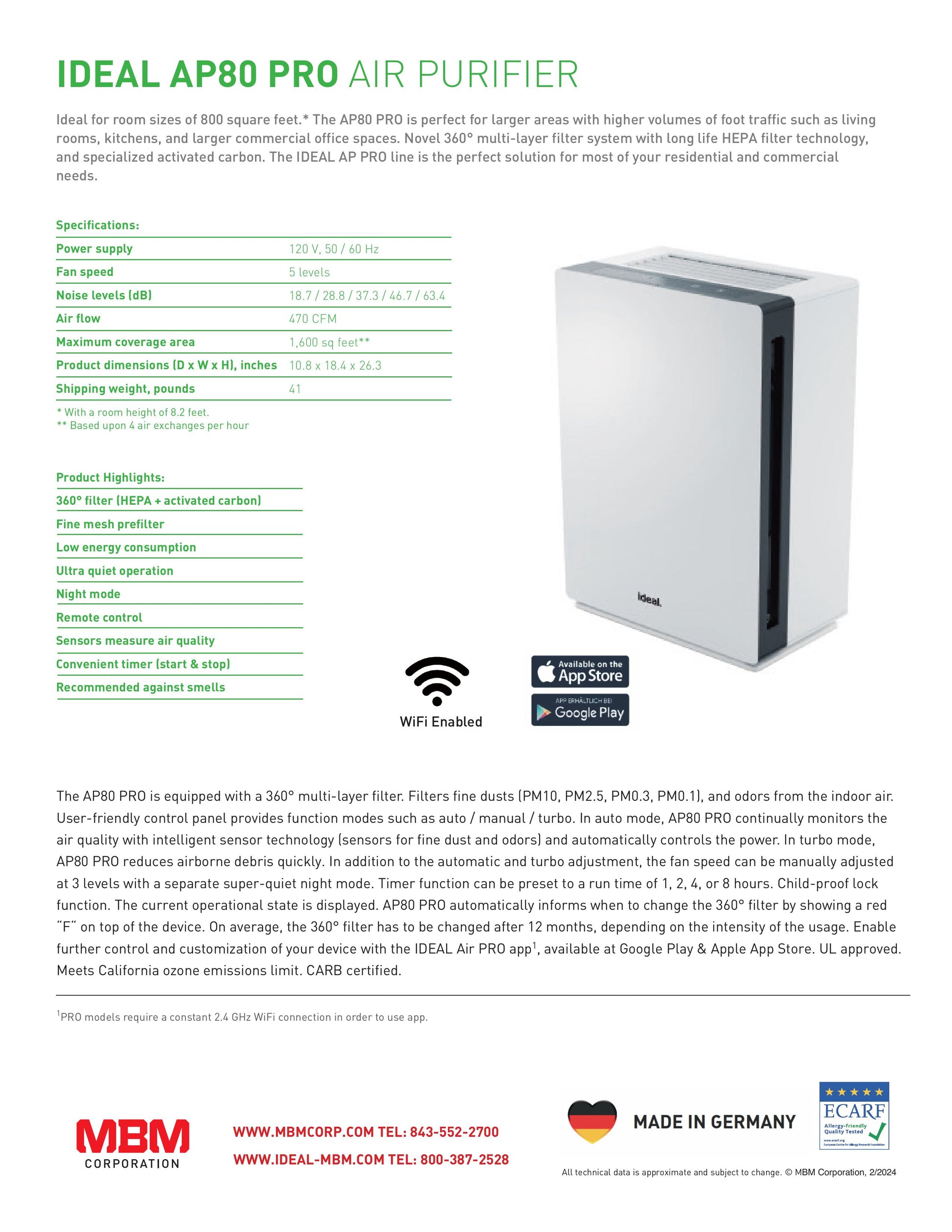 User-friendly control panel provides function modes such as auto / manual / turbo. In auto mode, AP80 PRO continually monitors the air quality with intelligent sensor technology (sensors for fine dust and odors) and automatically controls the power. In turbo mode, AP80 PRO reduces airborne debris quickly. In addition to the automatic and turbo adjustment, the fan speed can be manually adjusted at 3 levels with a separate super-quiet night mode. Timer function can be preset to a run time of 1, 2, 4, or 8 hours. Child-proof lock function. The current operational state is displayed. AP80 PRO automatically informs when to change the 360° filter by showing a red "F" on top of the device. On average, the 360° filter has to be changed after 12 months, depending on the intensity of the usage. Enable further control and customization of your device with the IDEAL Air PRO app', available at Google Play & Apple App Store. UL approved.