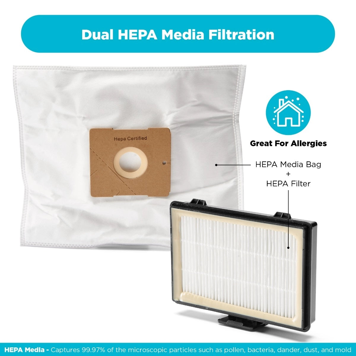 Dual-certified HEPA filtration ensures dust, dander and other particles are captured, keeping the whole household safe and healthy. The Jill includes a full-bag indicator and a metal wand that, combined with the hose, extends your reach to 10 feet, making cleaning a breeze.