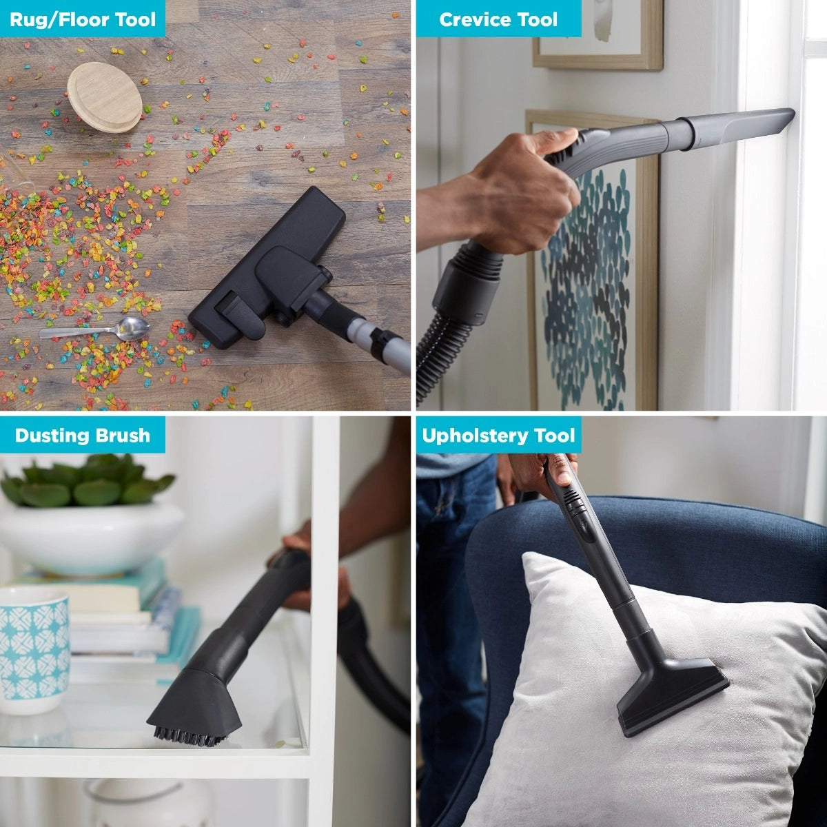 The Jill compact canister vacuum features a HEPA media bag and filter, plus a unique floor tool to clean bare floors and area rugs. This spunky, lightweight little canister comes with handy tools that mount on the metal wand and are perfect for cleaning nooks, blinds and everything else above the floor.